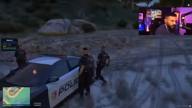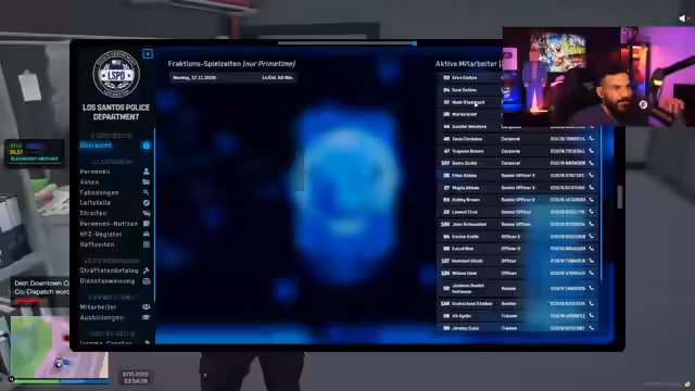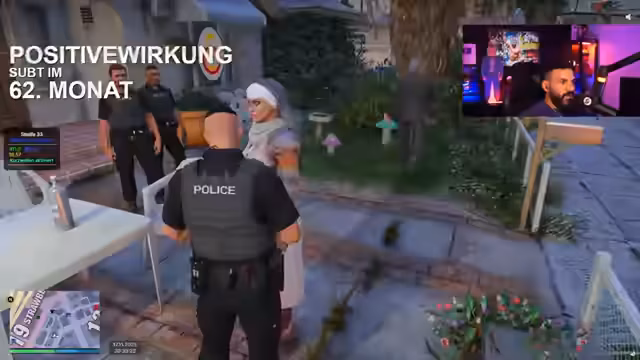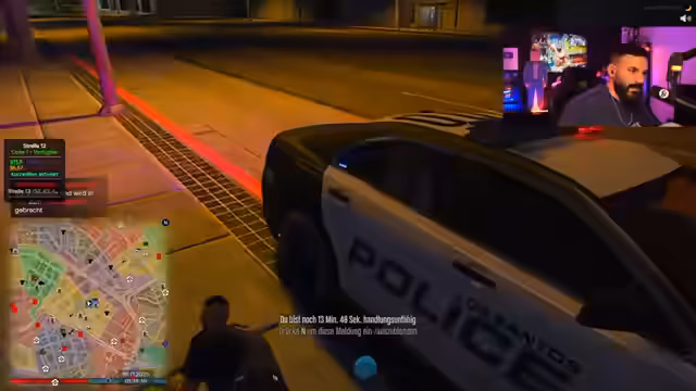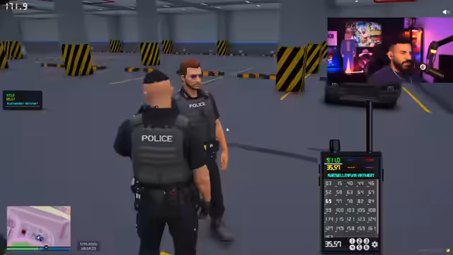00:27:18Der Streamer richtet den Polizeifunk ein und kommuniziert mit seinen Kollegen. Er trifft auf zwei Rookies, Uluda und einen weiteren, und übernimmt die Führung der Streife. Es werden Ausrüstungsgegenstände wie Schutzwesten, Funkgeräte und Taser überprüft. Nach anfänglichen Schwierigkeiten mit dem Auto und der Organisation der Rookies, die er humorvoll kritisiert, melden sie sich für die Streife 33 bei Mike Wagner an. Es kommt zu einer kurzen Spielpause aufgrund eines defekten Autos. Währenddessen wird ein Anruf eines Bürgers namens 'Herr John Schwabbel Titte' entgegengenommen, dessen Name für Belustigung sorgt und von Hector geändert wurde.