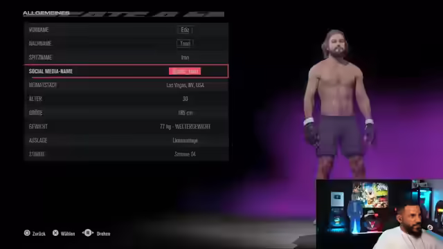 01:34:44Es wird das Produkt 'Soja' vorgestellt, ein Menthol-Inhalator, der als gesunde Alternative zu zuckerhaltigen Getränken und Vapes vermarktet wird, die von vielen Influencern promoted werden. 'Soja' soll die Atemwege öffnen und im Alltag Entspannung bieten. Anschließend beginnt der Streamer eine Karriere im UFC-Spiel. Zunächst wird ein Charakter erstellt, wobei der Kampfstil auf Kickboxen festgelegt wird, um mehr auf Striking zu setzen. Der Vorname des Charakters ist Edith, und es wird versucht, einen passenden Nachnamen und Spitznamen zu finden. Es wird ein individueller Name erstellt, aber aufgrund unzulässiger Zeichen akzeptiert das Spiel diesen nicht. Schließlich wird der Spitzname Iron gewählt. Weitere Details wie Social Media Name, Heimatstadt und Alter werden festgelegt. Die Heimatstadt wird auf Kars gesetzt, da Istanbul nicht verfügbar ist. Die Körpergröße wird auf 1,91 Meter und die Gewichtsklasse auf 84 Kilogramm eingestellt.