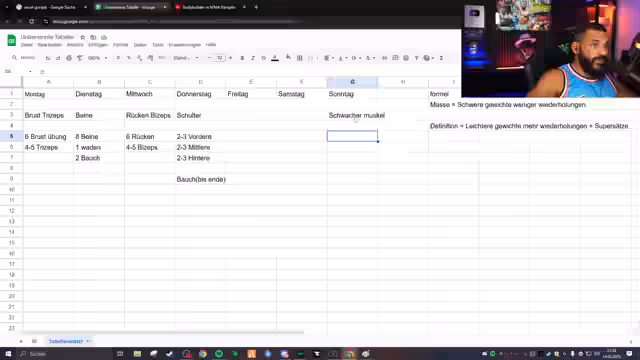 02:01:40Aufgrund von Anfragen im Chat beginnt der Streamer damit, einen strukturierten Trainingsplan für seine Zuschauer zu erstellen. Er klärt grundlegende Konzepte des Krafttrainings und erklärt die entscheidenden Unterschiede zwischen Masse- und Definitionstraining. Für den Muskelaufbau (Masse) empfiehlt er schwere Gewichte und weniger Wiederholungen, während für die Definition (weniger Körperfett, mehr Athletik) leichtere Gewichte, mehr Wiederholungen und Techniken wie Supersätze geeignet sind.