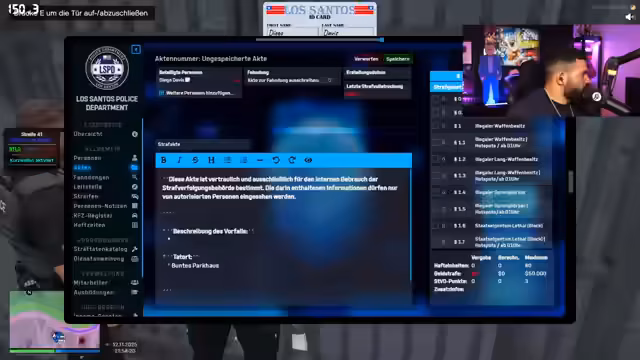 01:32:10Der Streamer widmet sich intensiv der Aktenführung, um die Verhaftung von Julian Chico korrekt zu dokumentieren. Er beschreibt die Schwierigkeiten beim Navigieren durch die Menüs und das Erstellen einer neuen Strafakte. Die Details des Vorfalls, einschließlich des illegalen Waffenbesitzes, der Flucht und der Missachtung von Anweisungen, werden festgehalten. Trotz kleinerer Fehler, wie dem Vergessen der Flucht in der ersten Akte, zeigt er sich engagiert, die Prozesse zu lernen und zu verbessern. Die Verhängung einer Geldstrafe und von Hafteinheiten für den Wiederholungstäter verdeutlicht die Konsequenzen von Straftaten im RP-Universum und die Bedeutung einer korrekten juristischen Abwicklung.