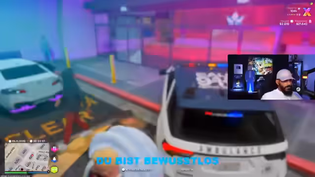 01:31:46Der Streamer drückt seine Frustration aus und kündigt scherzhaft an, dass er keine Lust mehr hat, da er sich allein gelassen fühlt. Er beobachtet, wie andere überfallen werden, und bezeichnet die Situation als „richtiger Asylpark“. Kurz darauf wird er selbst in eine Auseinandersetzung verwickelt, bei der er versucht, ein "Medik-Auto" zu bekommen. Die Szene wird von weiteren chaotischen Interaktionen begleitet, darunter das Überfahren einer Person, die als „Lil Wayne“ bezeichnet wird. Der Streamer wird von Polizisten aufgefordert, seine Hände hochzunehmen, da sie sein Auto stehlen wollen. Es kommt zu einem Gerangel um das Fahrzeug, bei dem der Streamer versucht, die Hilfe seines Mods „Samu“ zu erhalten. Die Situation wird noch absurder, als festgestellt wird, dass das gestohlene Auto keine Reifen hat und der Fahrer als „fetter Türke“ bezeichnet wird. Die Notwendigkeit, die verletzte Person zum Medic zu bringen, wird erkannt, was die Ernsthaftigkeit der Situation unterstreicht.