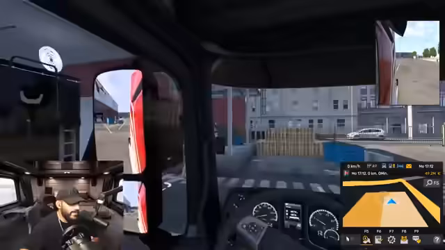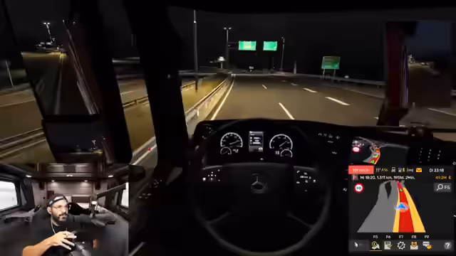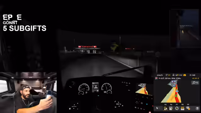 00:24:38Nachdem der LKW sorgfältig eingerichtet und die Fahrt Richtung Türkei angekündigt ist, beginnt die virtuelle Reise. Der Streamer startet in Nürnberg, holt einen Anhänger ab und nimmt den ersten Auftrag für eine Fahrt nach Istanbul an. Bevor die lange Fahrt beginnt, nutzt er die Raststätte, um den realen Wechsel zur virtuellen Nachtfahrt zu vollziehen und eine realistische Stimmung für das Stream-Publikum zu schaffen.