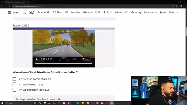 01:35:00Die Führerscheinprüfung nähert sich ihrem Ende. Der Streamer versucht, sich an Faustregeln für Bremswege zu erinnern, scheitert aber kläglich an der Mathefrage. Er wimmelt eine Frage nach einem Bahnübergang ab, da er nicht vor 'einer roten Laterne' anhalten will. Bei der letzten Frage, die ein Hindernis auf der Straße thematisiert, bleibt bei seiner Strategie, sofort stark abzubremsen und nicht auszuweichen. Mit dem Satz 'wir haben es fast geschafft' endet der Teil der Prüfung, der mit einem völligen Desaster seines Images und hoher Unterhaltung für das Publikum endete.