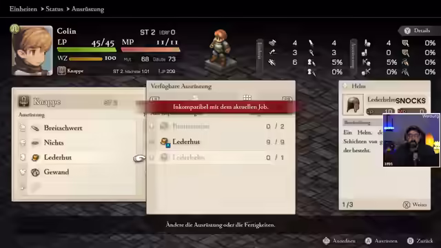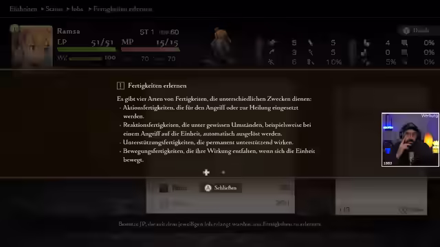 01:00:54Es wird das Hauptmenü aufgerufen und die verschiedenen Funktionen erklärt: Einheiten, Gegenstände, Chronik. Es wird versucht, eine Einheit auszurüsten. Der Einheitsstatus wird aufgerufen, um Waffe, Ausrüstung und Fertigkeiten zuzuweisen. Es wird ein Jobwechsel vorgenommen. Es wird erklärt, wie man die Reihenfolge der Einheiten verändern kann. Es wird der Statusbildschirm der Einheit erklärt: Stufe, Erfahrungspunkte, Lebenspunkte. Es wird überlegt, wofür WZ steht. Es wird über Nightbot-Links und PC-Spiele gesprochen. Final Fantasy Tactics wird als total geil bezeichnet. Es wird der Char durchgewechselt und besondere Statuswerte angezeigt. Es wird überlegt, was man durchspielt: Lederhut, Gewand, Kampfstiefel. Es wird nach Jobs geguckt: Knappe, Chemikus, Ritter, Schütze, Magier. Es wird versucht, als Magier zu spielen. Es wird erklärt, wie man neue Fertigkeiten erlernen kann. Es gibt vier Arten von Fertigkeiten: Aktionsfertigkeiten, Reaktionsfertigkeiten.