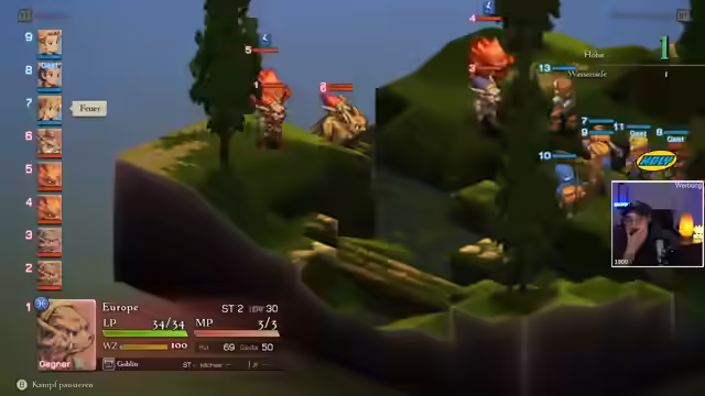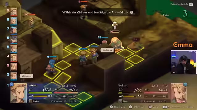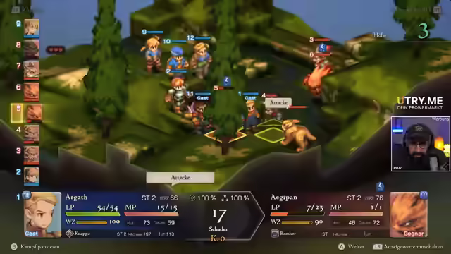 01:44:57Es wird sich über einen Raid gefreut. Es wird erklärt, dass man sich im Final Fantasy Tactics Placement befindet und auf der schwersten Stufe spielt. Es wird ein Kampf gegen Bestien vorbereitet. Die Truppe wird aufgestellt, wobei Colin als Nahkämpfer, Sören als Schütze und Patrice als Chemicus positioniert werden. Es wird festgestellt, dass es besser ist, gegen Bestien zu kämpfen als auf dem Schlosser herumzuhocken. Es wird betont, dass es um Leben und Tod geht. Es wird gegen die Streitereien der Charaktere appelliert. Der Kampf beginnt mit zwei Gästen, die erst einmal ihr eigenes Ding machen. Es wird überlegt, wie man den Kampf am besten angeht, wobei Ramsa als Magier nicht zum Tanken geeignet ist. Es wird festgestellt, dass man nicht sofort attackieren kann und dass es gefährlich wäre, zu weit nach vorne zu laufen.