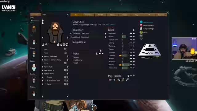 03:31:09Für den neuen Run wird ein Szenario namens 'Gigachats' erstellt. Der Streamer gründet eine eigene Supremacist-Religion mit freier Liebe und organisierten Hinrichtungen, was den Kolonienutzen maximieren soll. Als Relic wird ein legendäres Alpha-Thrumbo-Horn ausgewählt, das als mächtiges Symbol dienen soll. Gleichzeitig wird der Startcharakter namens 'Chat' erstellt, wobei schwierige Eigenschaften wie 'Fast Learner' und 'Tough' gefehlt haben, was den Streamer frustriert.