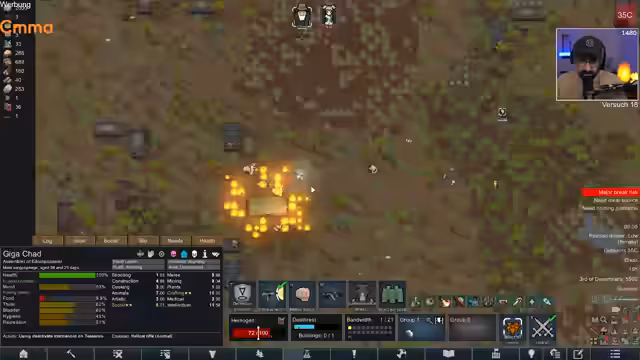 07:59:01Um das Raumschiff fertigzustellen und eine Beute zu machen, wird der Mechanoiden-Cluster als perfekte Schildwaffe gegen das bevorstehende Monster genutzt. Stahl bleibt der wichtigste Rohstoff, der nun eiligst abgebaut wird. Gleichzeitig werden Komponenten gesammelt und das Raumschiff weiter ausgebaut. Die Zeit drängt, da das Monster in wenigen Tagen aus seinem Behälter entweichen wird. Der Streamer hofft, dass die Mechanoiden das Monster lange genug aufhalten, um selbst die Flucht vorzubereiten.