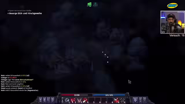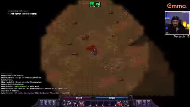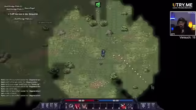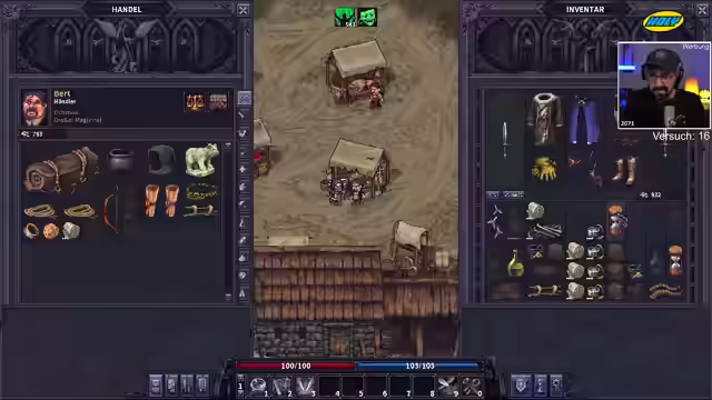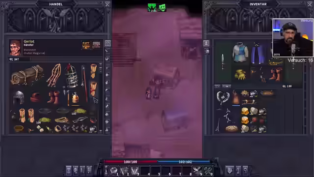 00:36:12Der Streamer freut sich über einen gefundenen gelben, unidentifizierten Dolch und identifiziert diesen als Bürgerdolch. Er stellt fest, dass er langsam besser im Spiel wird. Er entdeckt zufällig einen unidentifizierten Trank und identifiziert diesen später. Es wird überlegt, ob sich die Identifizierung lohnt. Der Streamer plant, die Brauerei-Quest anzugehen und vorher noch die Schwerter abzuholen. Er identifiziert einen Dolch und einen Ring, wobei der Dolch eine Rüstungsdurchdringung von plus 4 hat. Der Ring gibt Blutungresistenz und Energieregeneration. Er verzaubert seinen anderen Dolch mit einer Betäubungschance von 5%. Der Streamer kauft Essen für die bevorstehende Quest und überlegt, ob er eine Spitzhacke kaufen soll. Er stellt fest, dass er einen Brechstein kaputt gemacht hat und somit Platz für die Spitzhacke hat. Beim Schneider kauft er bessere Ausrüstung, wie eine Magistrat-Gambison, Handschuhe, Stiefel und einen Gürtel, wodurch er seine Ausweichchance und Blockchance erhöht, aber Erschöpfungsresistenz verliert. Er ist nun pleite, hat aber seine Ausrüstung verbessert.