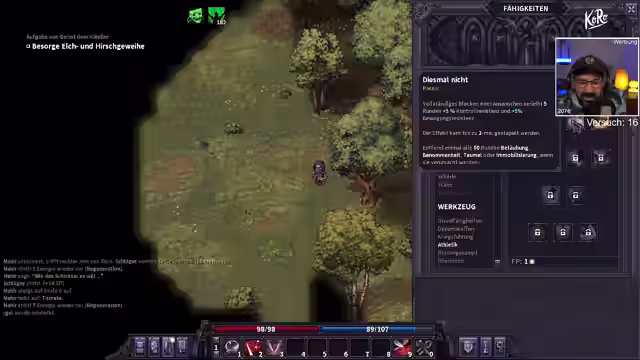 00:14:19Der Streamer analysiert seine Dolch- und Doppelwaffen-Skills, wobei er besonders auf die Effizienz und Schadensmöglichkeiten bei niedrigem Leben eingeht. Er erklärt, wie die Kombination von Fertigkeiten zusätzliche Schläge und Effizienz verleihen kann. Es wird überlegt, ob man in Pyromantie investieren soll, verwirft die Idee jedoch aufgrund der hohen Fehlschlagchance, die zu selbstverursachtem Schaden führen könnte. Stattdessen konzentriert man sich auf den Nahkampf mit Dolchen. Beim Levelaufstieg werden Beweglichkeit und Handeffizienz priorisiert. Eine neue Taktik wird ausprobiert: Der Wechsel von einer Brechstange zu Dolchen kurz vor dem Kampf, um Konter- und Krit-Chance zu erhöhen. Dies soll in Kombination mit dem Skill 'Flinke Hände' die Abklingzeiten der Dolchfertigkeiten reduzieren und häufigere Angriffe ermöglichen.