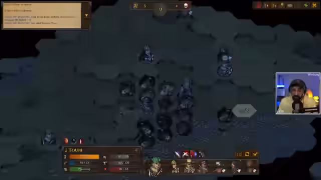 01:50:38Während eines Kampfes gegen Orks wird eine gefangene Schildmaidin befreit, die sich sofort dem Team anschließt. Die neue Kämpferin, die er 'Suki' nennt, hat exzellente Talente wie 'Colossus' und 'Shieldwall', ist aber momentan ohne Ausrüstung und hat nur wenig Leben. Ihr Rettung kostet das Team jedoch: Sie erleidet einen Hirnschaden und einen Verlust von maximaler Ausdauer durch den Angriff.
