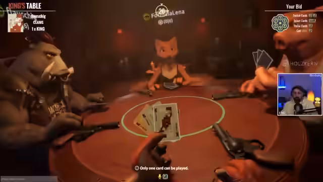 06:17:10Das Spiel beginnt mit einer Runde King's Table, bei der die Spieler Karten werfen und sich gegenseitig bezichtigen, zu lügen. Es wird über die Spieltaktiken gesprochen, etwa ob es sinnvoll ist, sofort mit einer Lüge zu starten, um andere zu täuschen. Streamer und Zuschauer müssen ihre Mikrofone anpassen, um die Bewegungen der Mundpartien beim Würfeln nicht zu verraten. Die Runde ist lang und von mehreren Bluffs und Fehlankündigungen geprägt.
