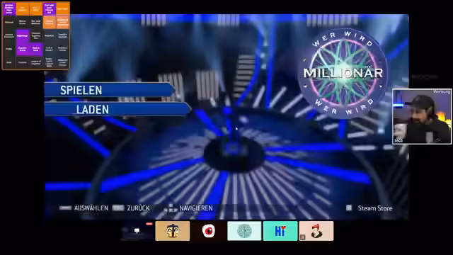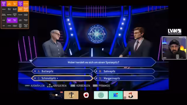 05:52:25Während die Mitspieler auf das Startsignal des nächsten Spiels warten, wird eine Runde des Quizspiels 'Wer wird Millionär?' gespielt. Die Fragen sind breit gefächert und umfassen Themen wie Fußballgeschichte, Botanik, Anime und Popkultur. Das Team arbeitet zusammen, um die richtigen Antworten zu finden, und nutzt gelegentlich den Publikums-Joker. Die Atmosphäre ist interaktiv und humorvoll, wobei der Streamer die Schwierigkeit einiger Fragen kritisiert und die Wissenslücken des Teams thematisiert.