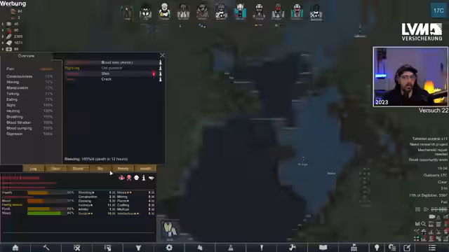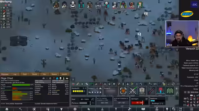 00:09:53Begrüßung des Chats und Einleitung mit technischen Problemen (Pebib-Sound). Ankündigung des heutigen Ablaufs: Drei Stunden RimWorld-Spielzeit, gefolgt von einem spontanen Jahresrecap ohne Vorbereitung. Persönliche Notizen zur Weihnachtszeit, Koffein-Abstinenz und Verwirrung über die unklare Zielsetzung dieser Pause. Privater Termin um 20 Uhr zum Nägeln wird kurz erwähnt.
