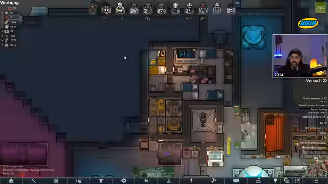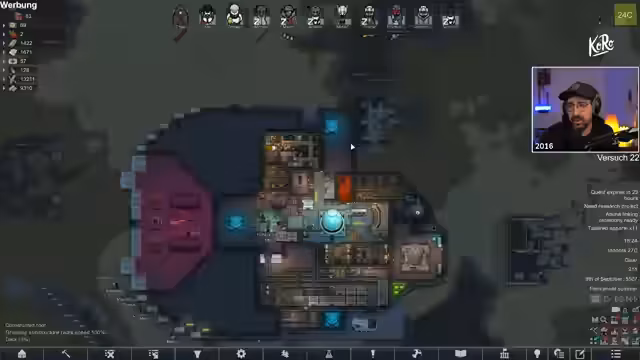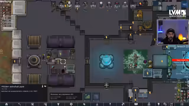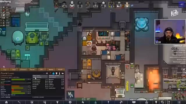 01:40:51Das Sauerstoffsystem wird überprüft: Ventile sind größtenteils funktional, aber eine Überarbeitung ist nötig. Parallel dazu wird der Wohnbereich neu geplant: Einzelzimmer gegen gestörten Schlaf (Doppelbetten verursachen Minus-4-Moral) oder Schlafimplantate als Alternative. Diskutiert wird auch die Anima-Baum-Integration im Raum. Schneeprobleme erschweren das Außenclearing, weshalb Heizversuche gestartet werden. Ein gefangener Boss wird aus humanitären Gründen geheilt und freigelassen.