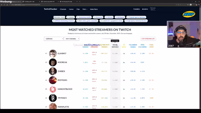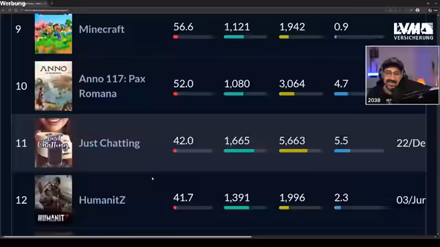 03:46:21Die erfolgreichsten Spiele des Jahres werden vorgestellt: Stone Shard (6), Battle Brothers (5), Factorio (4), The Long Dark (3), Project Zomboid (2) und RimWorld (1). Projekte Zomboid erzielt mit 217 Stunden und 8.600 Maximalzuschauern die höchsten Werte. Abschließend werden Gesamtstatistiken präsentiert: 2.028 Streamstunden, durchschnittlich 1.500 Zuschauer, 182 Millionen Minuten Gesamtschaudauer und 7.000 neue Follower.