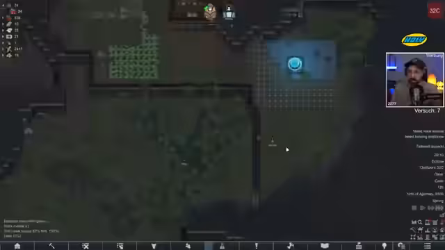 02:10:28Die Streamer haben Fortschritte beim Bau ihrer Basis gemacht, stoßen aber auch auf Hindernisse. Sie müssen sich mit knappen Ressourcen und den Herausforderungen des Spielings auseinandersetzen, wie z.B. dem Mangel an Holz und der Notwendigkeit, schnell genug zu bauen, um den 30-Tage-Frist zu entsprechen. Der Streamer arbeitet daran, eine Bergbasis zu errichten, die besser Schutz vor den Void bietet. Gleichzeitig müssen die Charaktere mit ihrer Gesundheit und Moral umgehen, besonders wenn sie unter Stress stehen. Die Streamer-Community ist weiterhin engagiert und gibt Ratschläge, wie das Spiel weitergeführt werden kann.