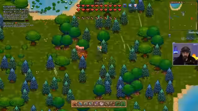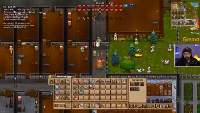 00:20:02Um die Vorbereitung für den nächsten Bosskampf abzuschließen, geht der Streamer auf eine wichtige Ressourcenjagd. Er benötigt Hühner für die Nahrungsmittelproduktion und Sonnenblumen zur Herstellung von Heil-Tränken. Eine Hühnerjagd endet vorerst frustrierend, da er in einem Dorf die Hühner nicht kaufen und stattdessen alle tötet und dafür eine Straße von 2.500 Gold zahlen muss. Schließlich findet er im Dorf 'Bed Igel' funktionierende Händler. Parallel dazu automatisiert er die Verwaltung seiner Siedlung, indem er Dorfbewohner mit dem Sortieren von Ressourcen und der Herstellung von Nahrung und Tränken beauftragt, was ihm mehr Spielraum für Erkundungen gibt.