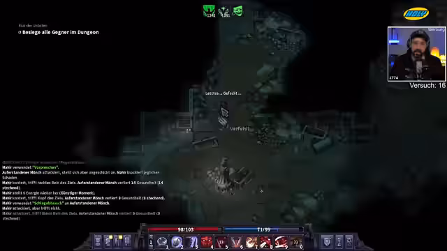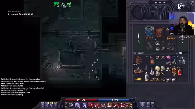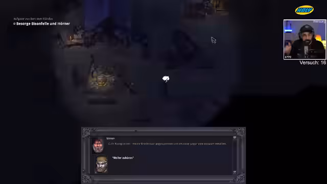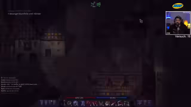 00:28:53Ein Schwarzhändler gibt einen gefährlichen Auftrag in der Stadt Brynn: Ein mysteriöses 'Tier' muss aus seinem Keller entfernt werden. Nachdem der Streamer den Auftrag annimmt, stellt sich heraus, dass es sich nicht um einen normalen Eber, sondern um einen extrem mächtigen Ghoul handelt, der zwei Wachen getötet hat. Der Kampf wird überlebt, kostet aber zwei Leben und erfordert eine hohe Belohnung in Form von Gold, was die finanzielle Lage weiter belastet.