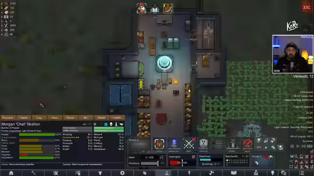 04:14:26Der Stream konzentriert sich auf den Aufbau einer Religion mit dem Animatree. Ein Kollege soll zum Priester ernannt werden, um den Forschungsfortschritt zu beschleunigen. Der Plan ist, mehrere Bewohner durch Meditation am Baum zu leveln, um Zauber schneller zu erlernen. Der Cerebrex Core wird als sehr stark angesehen, jedoch nutzlos gegen die Void, die als extrem gefährlich gelten. Der Wunsch nach einer Partnerkolonie wird geäußert, um die Stimmung der Bewohner zu verbessern und die Kriminalität zu senken.