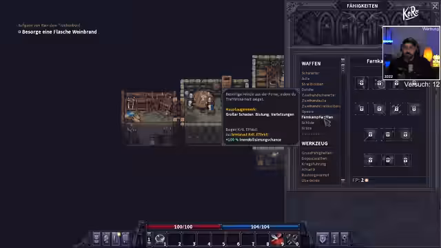 00:12:51Zurück in Stone Shard spielt der Streamer seinen Waldhüter-Level-3-Charakter, dessen Fokus auf Wahrnehmung liegt. Die nächsten beiden Skillpunkte werden ebenfalls in Wahrnehmung investiert, um Sichtweite, Reichweite, kritische Treffer und Wunderschance zu erhöhen. Die Ausrüstung ist bis auf einen neu erhaltenen Köcher und einen Ring noch Standard. Mit 461 Monetas im Besitz und einem Stärkungsbonus nach einer Nacht in der Basis steht die erste Hauptaufgabe an: die zweite Quest im Dorf Eltest anzunehmen.