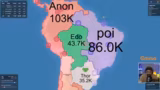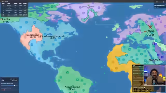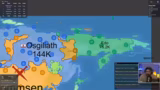 00:16:18Der Streamer startet eine Open Front-Lobby für den Chat und stellt den Spielmodus vor. Er erklärt die Grundlagen: Die Spieler starten klein, expandieren durch Klicks auf die Landkarte und bauen Städte oder Häfen. Das Ziel ist, 60% der Landmasse zu kontrollieren. edopeh beginnt eine erste Runde, zeigt aber strategisch unkluge Entscheidungen wie den Angriff auf übermächtige Gegner, was zu seinem schnellen Scheitern führt.