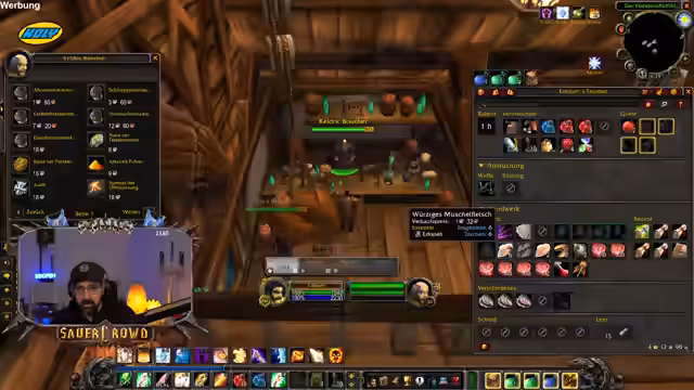 00:29:49Der Streamer kündigt an, seine vernachlässigte Kochkunst auf Level 50 zu bringen, um später Fischrezepte zu lernen. Er farmt hierfür Wolfs- und Eberfleisch im Dämmerwald, wofür er extra die Zone aufsucht. Gleichzeitig optimiert er sein Inventar, indem er Baganator nutzt und seine Taschen neu kategorisiert, um mehr Übersicht zu gewinnen. Sein Ziel ist es, Platz zu schaffen und alle Berufe effizient zu pflegen.