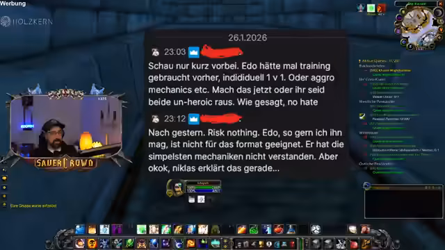05:10:38Der Streamer reflektiert über seine Reise und seinen Status als Anfänger in World of Warcraft. Er gibt zu, anfangs die simpelsten Mechaniken nicht gekannt zu haben, aber dank der Hilfe von anderen Spielern, insbesondere in Instanzen, hat er alles dazugelernt. Trotz seines ersten Todes in Deadmines hat er den Prozess genossen und die Fähigkeit, bei fast jedem Treffen mitzuhelfen und zu heilen, als sehr befriedigend empfunden. Er beschreibt den Prozess als ein on-the-fly-Lernen, das er als schöner ansieht als das Vorbereiten mit Videos und Guides. Die Veröffentlichung des 'SauerCrowd'-Projekts für Anfänger ist für ihn persönlich ein Erfolg, auch wenn er seinen Namen nicht dafür hätte zensieren müssen.