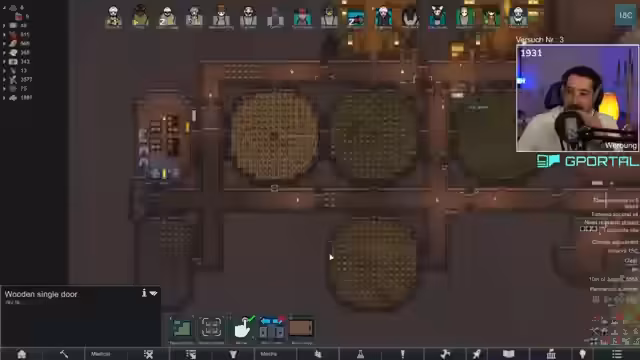 01:23:34Ein großes Insektennest erscheint, das die Kolonie bedroht. Der Streamer muss schnell eine Verteidigungsstrategie entwickeln. Er verteilt seine Kolonisten, darunter den Nahkämpfer Nashorn und die Scharfschützin Natascha, auf zwei Positionen. Es ist ein Kampf gegen die Zeit, da viele Kolonisten bewusstlos am Boden liegen und die Lampen plötzlich ausfallen, was die Lage weiter verschärft.