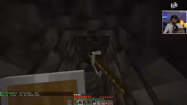 02:12:00Die Streamer erkunden eine tiefe Höhle auf der Suche nach Diamanten und treffen auf diverse Hindernisse wie Wasser und Lava. Sie entwickeln eine Strategie, um sicher durch tiefe Bereiche zu gelangen, indem sie Turen als Luftschächte nutzen und sich gegenseitig im Auge behalten. Die Kommunikation zielt darauf ab, sich nicht zu verlieren und auf gegnerische Aktivitäten vorbereitet zu sein, während sie mit der unübersichtlichen Umgebung und der zunehmenden Tiefe kämpfen.