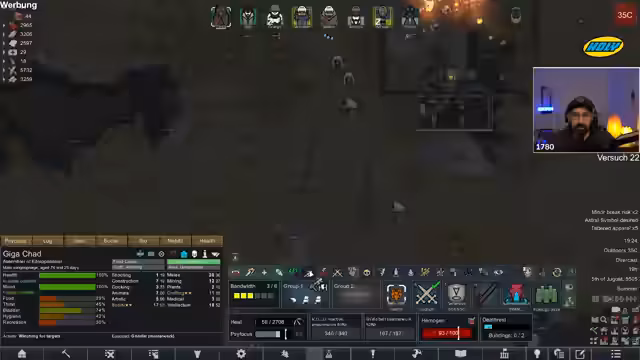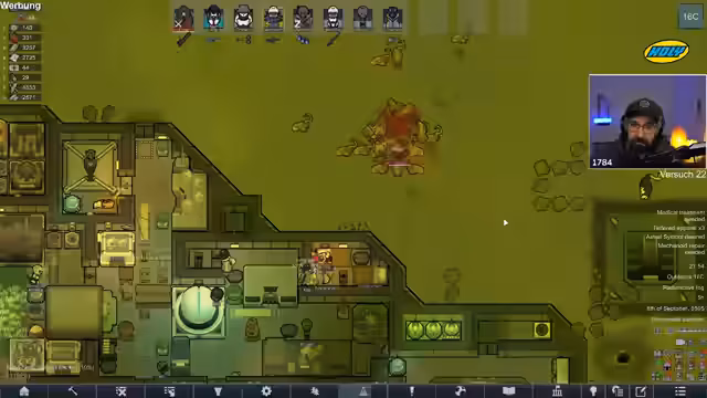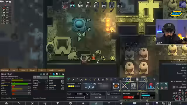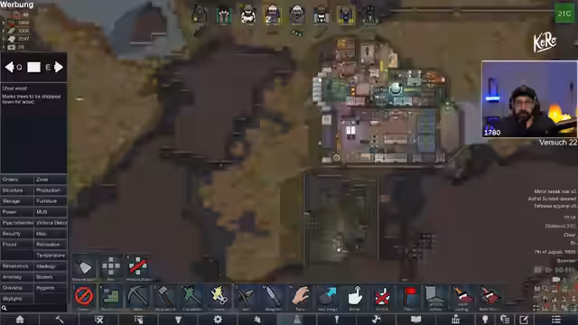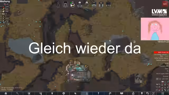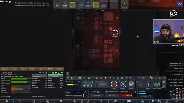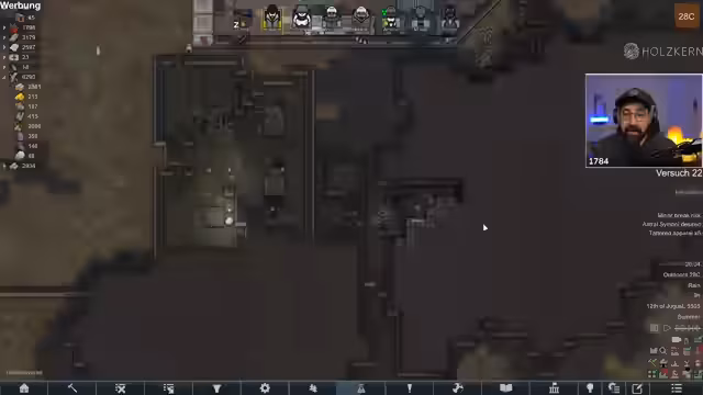 04:11:30Die RimWorld-Session (Versuch 22) beginnt mit einem akuten Problem: Ein Raid von 86 Militors greift die Basis an, während das Raumschiff erst in 22 Stunden wieder einsatzbereit ist. Das Team muss den Angriff abwehren. Ziel der Session ist es, das legendäre Schwert (Arco-Bringer) zu finden, dessen Location bekannt ist. Während des Spiels wird der Fortschritt diskutiert: Das Raumschiff wurde erweitert, ein Atomkraftwerk ist in Planung, und die Basis soll mit einer Krankenstation für Bionics ausgestattet werden. Zudem wird das Rune-System erkundet, das neue Möglichkeiten für Kämpfe und Heilung bietet.