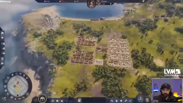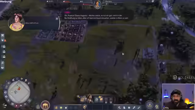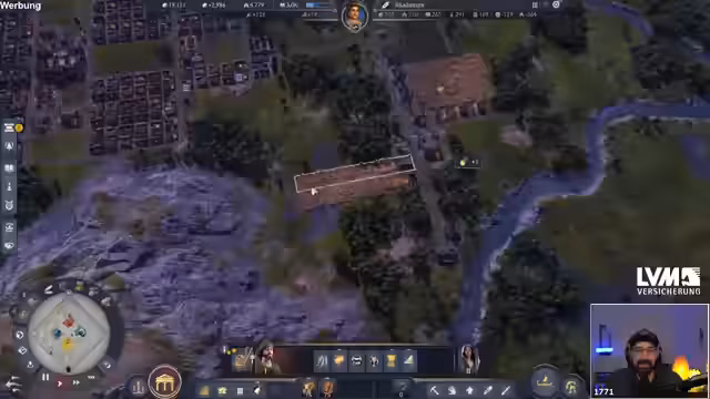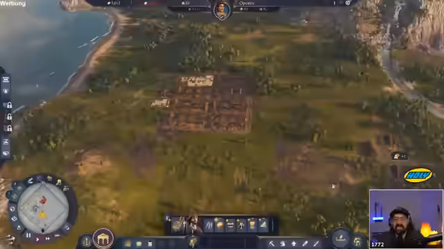 00:51:57Nach über 30 Minuten Vorbereitung startet das Anno 117 Event. Die Teams verteilen sich und beginnen mit der Inselerschließung. Das Streamer-Team (mit Yvraldis) diskutiert die Strategie: Fokus auf Ökonomie und Holzproduktion, um Arbeitskräfte zu sichern und Gebäude zu verbessern. Sie erkunden ihre Insel und bemerken Arbeitskräftemangel, den sie durch Lagerhäuser und Upgrades beheben wollen. Gleichzeitig beobachten sie die Gegner und stellen fest, dass diese ebenfalls noch am Aufbau sind. Das Team plant, später militärisch zu agieren, um Handelsrouten zu sichern.