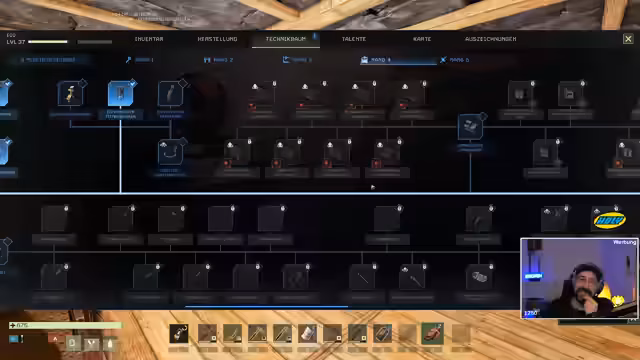 00:51:12Nach Abschluss der Turm-Mission looten die Streamer eine abgestürzte Versorgungskapsel, die verschiedene Belohnungen enthält. Eine der Belohnungen ist ein Platinengewebe, das für den Aufbau weiterer Fortschritte benötigt wird. Danach planen sie, direkt eine weitere, schwierigere Mission anzunehmen, um vor dem Streamende einen Bosskampf zu bestreiten. Parallel dazu werden die Talentpunkte weiter in Richtung Landwirtschaft und Kochen investiert, um Nahrungsmittel effizienter produzieren und haltbarer zu machen.