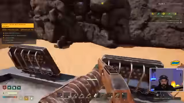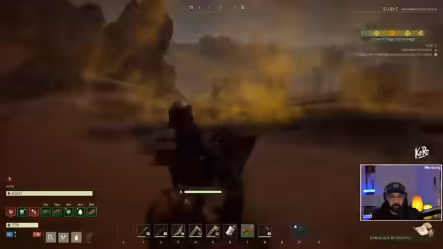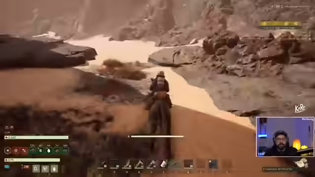05:11:34Der Streamer erkundet die Wüste und stößt auf viele Drohnen, die viel Munition und wertvolle Ressourcen wie Stahlherzstern fallen lassen. Er farmt aktiv Materialien, hält Ausschau nach Missionen und nutzt sein Reittier, das jedoch Probleme mit der Ausdauer hat. Der Fokus liegt auf dem Sammeln von Ressourcen und der Bewältigung der harschen Wüstenbedingungen, die den Fokus auf effiziente Farming-Strategien legen. Langsame Fortbewegung und technische Probleme mit der Kamera sind erwähnenswert.