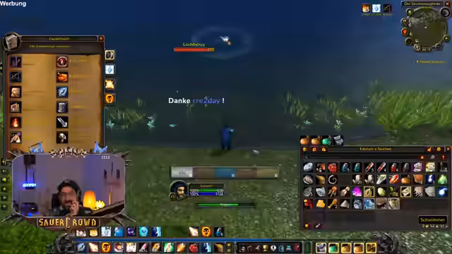 03:14:51Beim Leveln und Gründen ist das Inventar des Streamers dauerhaft voll, was seine Effizienz stark einschränkt, da er ständig Platz schaffen muss. Neben dem Hauptziel, Level 20 zu erreichen, um den Raid Todesminen zu bestreiten, unterhält er sich auch über ungewöhnliche Themen, wie die Herkunft von Spitznamen oder persönliche Hygiene. Er zeigt sich gelassen und amüsiert über die teils absurden und privaten Themen, die im Chat und in der Gilde auftauchen.