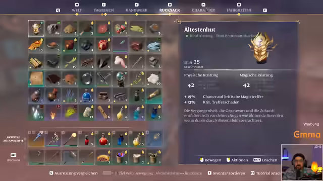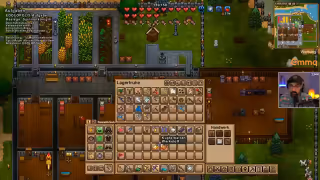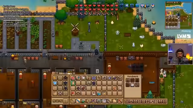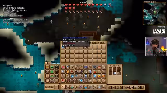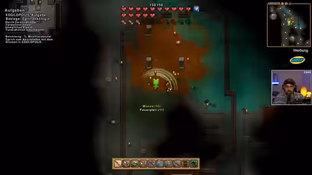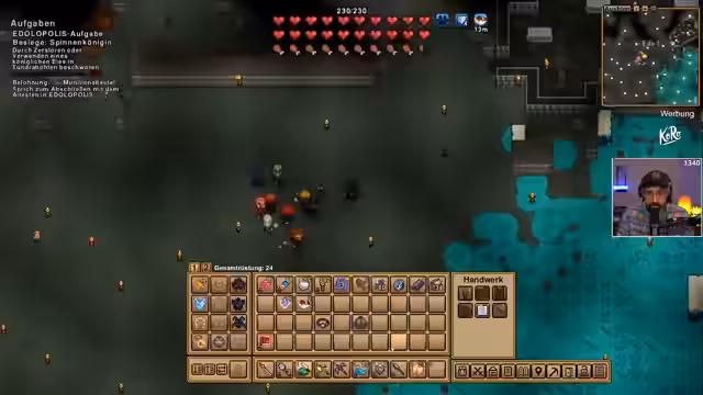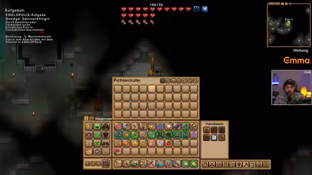 03:09:09Nachdem ein neuer Tierpfleger namens Samuel eingestellt wurde, der nun die Rolle des Landwirts übernimmt, da kein Landwirt mehr im Team war, wurde der Status der aktuellen Ausrüstung überprüft. Es stellte sich heraus, dass der Froststecher, ein Summoner-Stab, der Beschwörungsschaden von 34 und eine Critchance von 1 bietet, keine Beschwörungsplätze verbraucht. Dies ermöglicht die gleichzeitige Nutzung mit Spinnenbeschwörungen, was die Spielstrategie erheblich verändert. Der Streamer bemerkte, dass er dadurch wahrscheinlich nicht mehr mit dem Katana spielen wird. Weitere Drops der Spinnenkönigin umfassten ein Spinnenherz, ein königliches Ei, das die maximale Lebensenergie um 150 erhöht, sowie ein Schwert, Zubehör und ein Gewehr. Mit 280 HP durch das Ei ist der Charakter nun deutlich widerstandsfähiger. Als nächste Quest steht das Töten des leeren Zauberers in der zweiten Etage des Verlieses an, um einen Munitionsbeutel zu erhalten, der das Tragen zusätzlicher Munition ermöglicht.