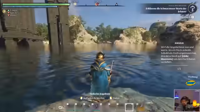 05:32:45Der Streamer geht zum Angeln und sammelt zunächst Glühwürmchen als Köder. Er beschreibt das Angel-System und den Kampf mit den Fischen, bei dem man auf die Bißmeldung reagieren und gegen die Bewegung des Fisches ankämpfen muss. Er fängt verschiedene Fischarten wie Seehüpfer und einen legendären riesigen Fischen, für den er eine bessere Angel und mehr Schnur benötigt. Er plant, einen Angelsteg und ein kleines Angelhäuschen am See zu bauen und Fische in einem Teich anzusiedeln.