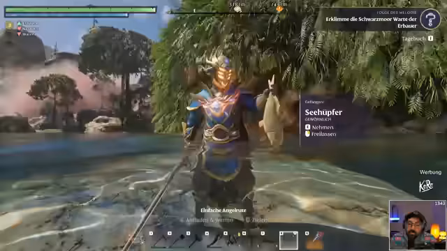 04:09:17Nach einem Kampf, bei dem er eine enorme magische Truhe erbeutet, schaltet der Streamer neue Rezepte frei und stellt fest, wie umfangreich das Spiel geworden ist. Er entdeckt das Wasser im Spiel, was ihn begeistert, und plant, eine Angel zu bauen. Er trifft auf Capybaras und Wasserreptilien, wobei Blitze sich als effektiv gegen Wassermonster erweisen. Er findet neue Rezepte wie Wasserreptilienleder und Schimmerflossen. Der Streamer ist beeindruckt von den neuen Bauoptionen, die das Wasser bietet, wie zum Beispiel Aquädukte, die Wasser über Berge in die eigene Basis leiten können. Er erwähnt, dass man sogar Unterwasser-Dungeons erkunden und dort Rätsel lösen sowie gegen Gegner kämpfen muss.