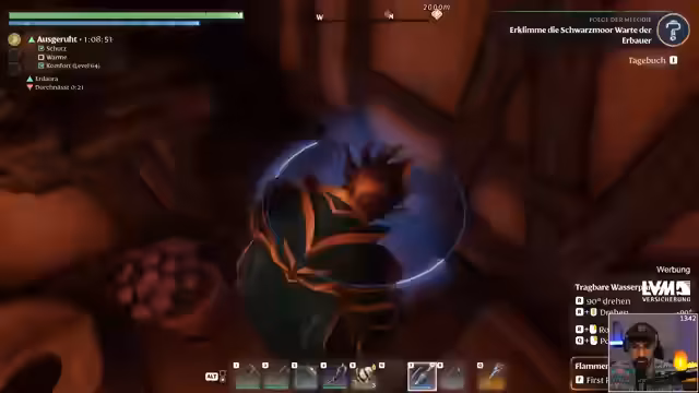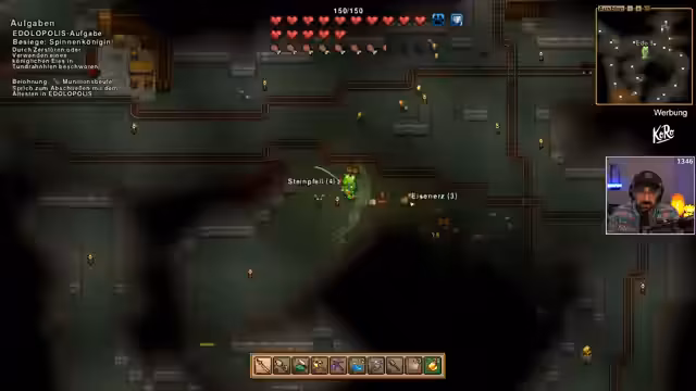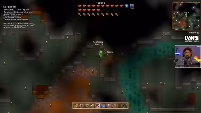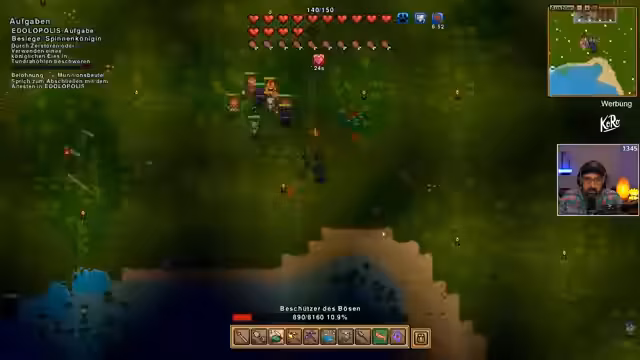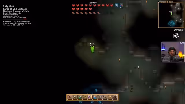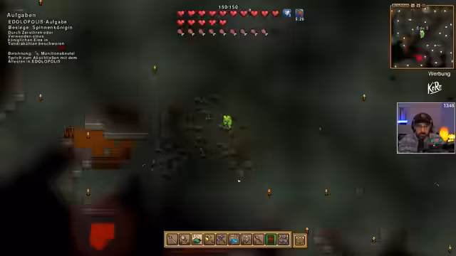 00:34:08Während der Erkundung der Tundrahöhlen entdeckt der Streamer das Königliche Ei, das zur Beschwörung der Spinnenkönigin dient. Er sammelt es ein, obwohl er fast tot ist, und plant nun den Bau einer Arena, um den Bosskampf strategisch angehen zu können. Er betont die Wichtigkeit einer Arena, um den Boss kiten zu können, ähnlich wie er es bereits in Terraria gelernt hat. Die Spinnenkönigin wird als riesig und gefährlich beschrieben, da sie sich in der Höhle über Steine bewegen kann, während der Spieler dies nicht kann, was ihn verwundbar macht. Er befürchtet, dass er mit seiner aktuellen Sammler-Rüstung, die nicht auf viel HP ausgelegt ist, leicht two-shottet werden könnte. Daher ist die Stärkung seiner Dorfbewohner und die Beschaffung von besseren Lebensmitteln, die HP pushen, von entscheidender Bedeutung. Er stellt fest, dass er noch den ersten Boss erneut besiegen muss, um alle seine Drops zu erhalten, da ein Item noch ein Fragezeichen ist. Die technische Probleme mit dem Spiel, die zuvor auftraten, scheinen nach einem Neustart behoben zu sein, was die Vorbereitung auf den Bosskampf erleichtert.