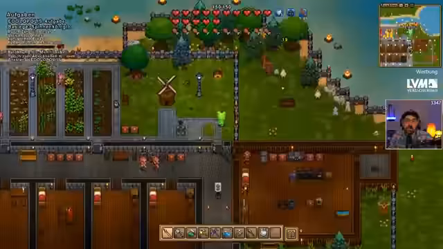 01:03:29Der Streamer plant, dringend eine Koro-Bestellung aufzugeben, da er seit Langem keine mehr gemacht hat und ihm wichtige Müsli-Zutaten fehlen, obwohl er Partner von Koro ist. Er bereitet sich auf einen Bosskampf vor, indem er weitere Zimmer in seiner Basis fertigstellt und Ressourcen sammelt. Ein Händler, der meist nur „Blödsinn“ verkauft, hat immerhin Trankbeutel im Angebot. Währenddessen arbeiten seine Leute fleißig auf den Feldern, und es gibt Nachwuchs in Form eines Babylamms und eines Eis. Er stellt sicher, dass alle Siedler genug zu essen haben, da er einen Koch eingestellt hat. Anschließend plant er, Ressourcen zu farmen, um den Boss beschwören zu können und den Weg für den Kampf freizumachen, um später kiten zu können.