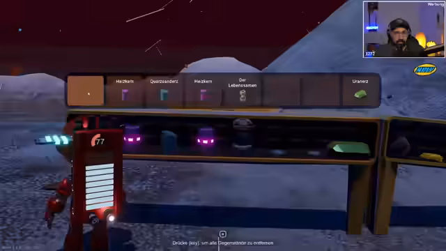 01:32:13Um Aluminium abbauen zu können, wird ein spezieller Abbaulaser benötigt, der an einen Wagen montiert werden muss. Da der vorhandene Bohrer nicht genug Strom hat, wird ein weiterer Wagen mit einer Batterie gebaut. Der Streamer muss dabei verschiedene Ressourcen wie Kupfer, Schwefel und Silber besorgen und stellt einen modularen Konvoi zusammen, der es ermöglicht, größere Ressourcengebiete zu erschließen.