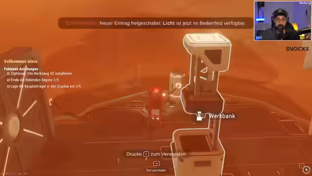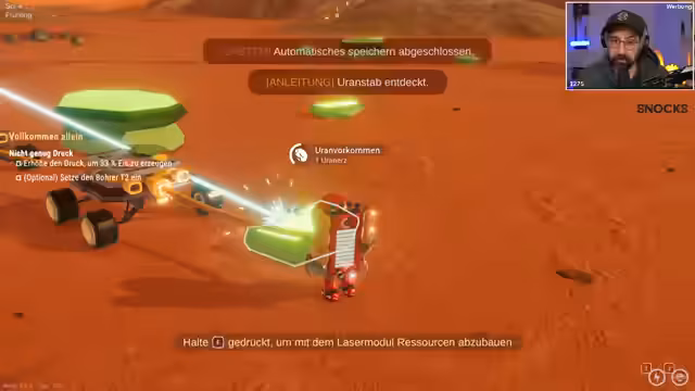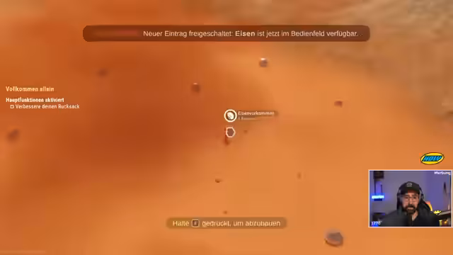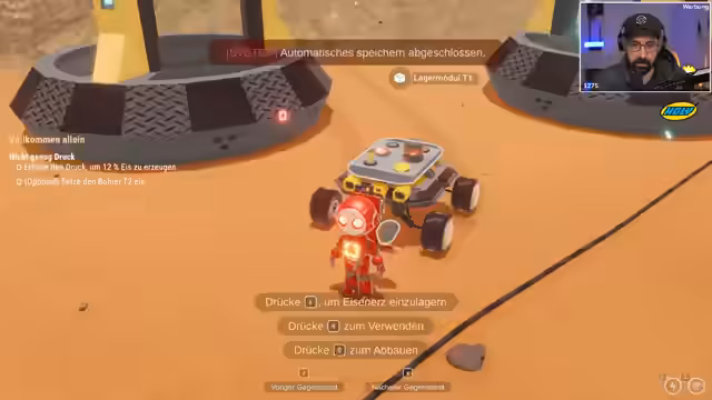 00:14:58Nach einer kurzen Überprüfung der Steam-Charts startet der Streamer ein neues Spiel. Er landet als Roboter auf dem Mars und beginnt mit dem Sammeln von Ressourcen wie Eisenerz. Er stößt auf anfängliche Herausforderungen, wie die begrenzte Rüstungskapazität und den schnellen Energieverbrauch. Mit Hilfe einer Werkbank kann er seinen Rucksack aufrüsten und erste Baupläne freischalten, wie den Drucker, um neue Gegenstände herzustellen und den Fortschritt im Spiel zu dokumentieren.