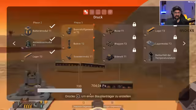 00:52:30Mit dem Bohrern wird der erste Terraforming-Meilenstein erreicht. Um die wachsenden Anforderungen zu bewältigen, schaltet der Streamer neue Baupläne frei, darunter ein Lagermodul und ein Rover-Fahrzeug. Er stellt den Rover her, der autonom arbeiten kann und als mobile Einheit zum Transport und Abbau von Ressourcen dient. Dies ermöglicht eine effizientere Erkundung der Marslandschaft und den Aufbau einer größeren, skalierbaren Infstruktur für die fortschreitende Terraformierung des Planeten.