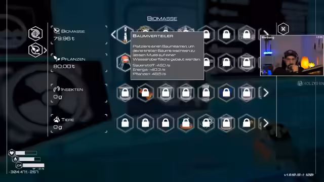 01:55:03Der Fortschritt stößt auf eine erhebliche Hürde: die Produktion von Biomasse. Diese ist für den Bau von wichtigen Strukturen wie dem Baumverteiler und der DNS-Manipulation notwendig. Der Streamer versucht das Problem durch den Bau von Raketen (Pflanzenmultiplikatoren) und Biodomen zu lösen, stellt aber fest, dass der Basiswert zu niedrig ist und der Einsatz der Raketen ineffektiv bleibt, was ihn frustriert.