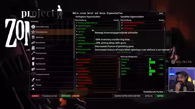 04:47:26Der Streamer analysiert seinen Charakter und die verschiedenen Skills in Project Zomboid. Er diskutiert über Vor- und Nachteile von Perks wie 'Stämmig', 'Pazifist' und 'Kurzsichtig'. Er entscheidet sich, 'Gewand' für seine benefits zu wählen, da es das Aimen verbessert und die Wahrscheinlichkeit von Waffenblockaden verringert. Er plant einen Build mit 'Dünnhäutig', 'Auffällig', 'Schwaches Immunsystem' und 'Kurzsichtig', während er seine Startausrüstung optimiert.