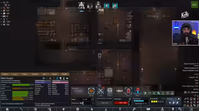 02:07:01Der Streamer konzentriert sich auf das Management seiner Ressourcen in der Project Zomboid-Kolonie. Er beschäftigt sich mit der Erweiterung der Bergwerkstunnel, um weitere Ressourcen wie Gold zu finden, obwohl er unsicher ist, ob dies für den Koloniewert lohnenswert ist. Gleichzeitig erwägt er, mehr Geschütztürme zu bauen, um sich auf bevorstehende Raids vorzubereiten. Die Kinder erhalten immer mehr Aufgaben und werden zu wichtigen Mitgliedern der Gemeinschaft.