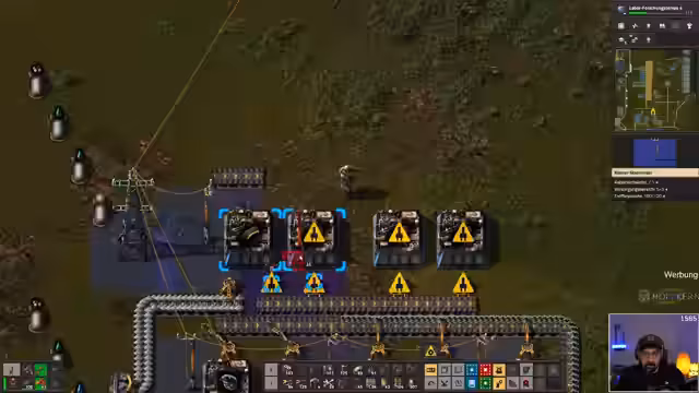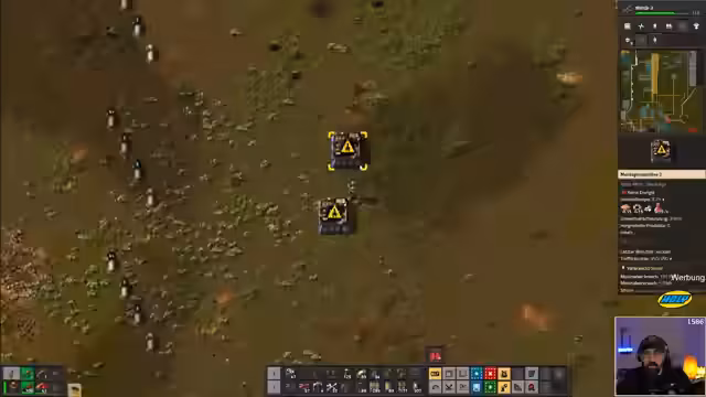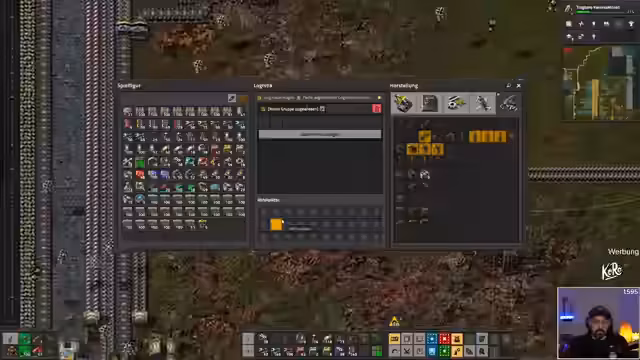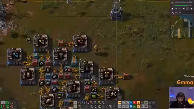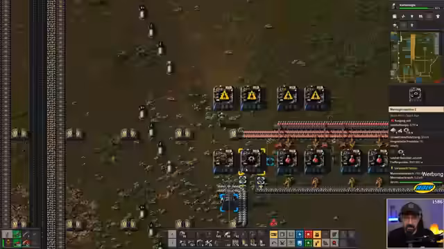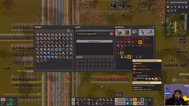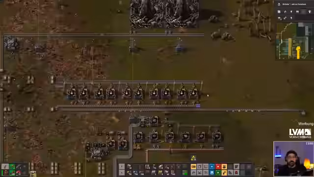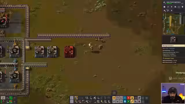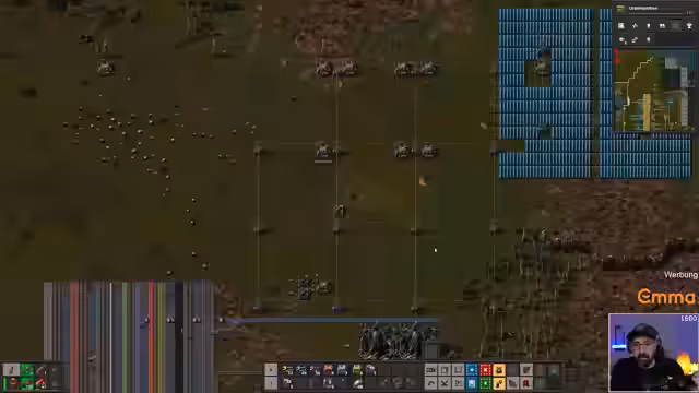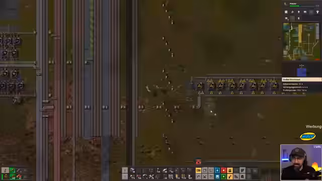 00:45:38Nachdem Laufbänder durch Angriffe beschädigt wurden, wird der schnelle Aufbau eines WLAN-Netzwerks priorisiert. Es sind bereits 12 Roboports mit über 600 Logistik- und fast 700 Baurobotern vorhanden. Der Streamer beginnt mit der Verlegung des WLAN-Netzes, während die Chat-Community die Bauweise kritisiert. Die Produktion der roten und grünen Science Packs wird auf einem Band zusammengeführt und als 'ausbalanciert' verteidigt, obwohl der Chat sie als 'Spaghetti' bezeichnet. Anschließend wird die Produktion der nächsten Wissenschaftspakete geplant, die Mauern, panzerbrechende Munition und Granaten erfordern. Die Herstellung dieser Komponenten erweist sich als äußerst komplex, da sie mehrere Zwischenschritte wie das Brennen von Ziegelsteinen und die Produktion verschiedener Munitionstypen erfordert. Der Streamer wünscht sich einen Stift und Block oder Excel, um die komplexen Produktionsketten besser planen zu können.