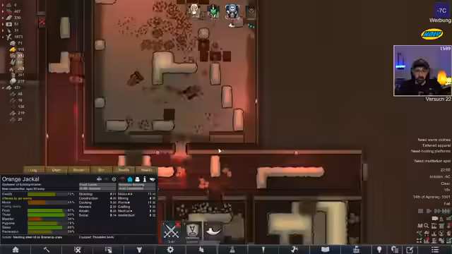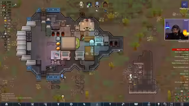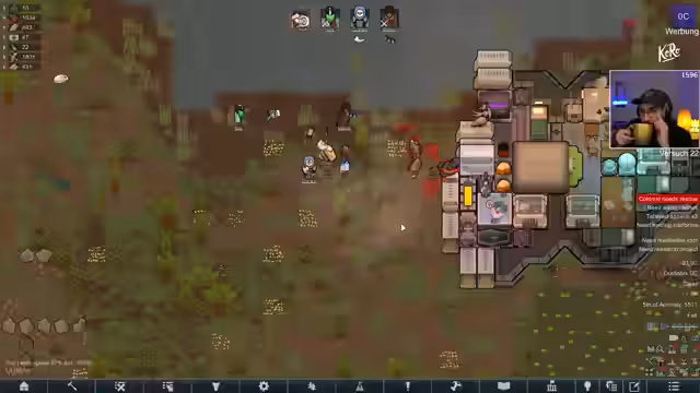 06:40:26Die Kolonisten in RimWorld leiden unter verschiedenen Problemen: starke Schmerzen, Hunger, kaputte Kleidung, eine hässliche Umgebung im Raumschiff und die Abneigung, auf diesem Planeten zu leben. Kitsch, einer der Kolonisten, ist besonders schlecht gelaunt. Ein weiterer Raid ist noch nicht vollständig abgewehrt, und es wird überlegt, die Gegner mit einem 'Spine' zu verlangsamen. Die Möglichkeit, ein riesiges Monster zu zähmen, wird in Betracht gezogen, aber aufgrund des fehlenden Platzes im Raumschiff verworfen. Das Ziel bleibt die Expansion zum Frozen Terraformer, um weitere Raumschiffteile zu erhalten. Ein Kolonist hat im Kampf rechte Hand, linken Arm und rechtes Bein verloren, was als 'okay' bewertet wird, da das Hauptziel die Expansion ist. Die schlechte Laune der Kolonisten aufgrund von 'eerie Noises' und die Notwendigkeit, schnell Lebensmittel zu ernten, bevor sie weiterfliegen können, werden thematisiert. Ein 'N4 Infected'-Event mit 67 Reapern wird angekündigt, was die Situation zusätzlich erschwert.