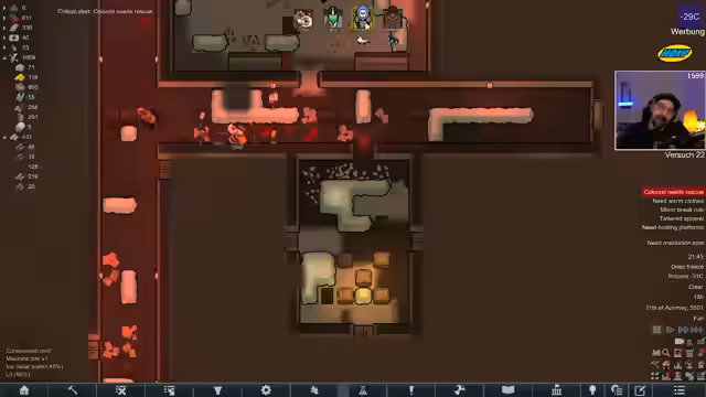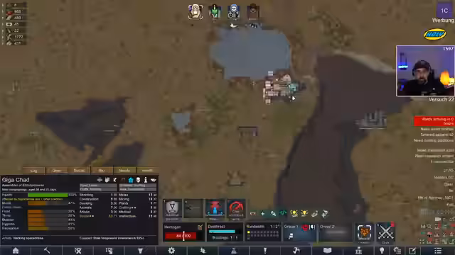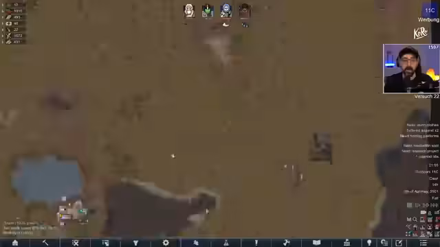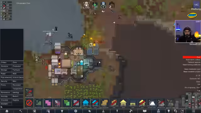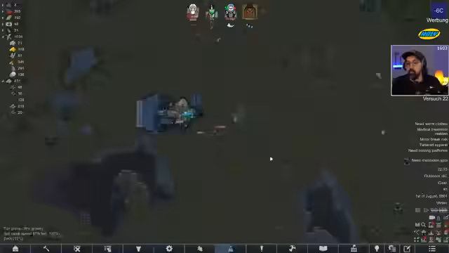 06:32:17Der Streamer kehrt zu RimWorld Void zurück und versucht, sich an die Ereignisse des Vortages zu erinnern. Er berichtet von einem wiederkehrenden Problem mit seinem Kopfhörer, der beim Aufsetzen ein Piepgeräusch macht, dessen Ursache er nicht kennt. Im Spiel sind die vier Kolonisten Chad, Kay, Orange und Naker unterwegs zum Frozen Terraformer. Letztes Mal mussten Mauern gebaut werden, da Krähen die Köpfe von zwei 'Woi' im Kühlschrank angegriffen und einen Kopf mit wichtigen Implantaten zerstört hatten. Neue Heilpflanzen wurden gesät, da die Lebensmittel knapp werden. Ein Mech-Cluster ist gelandet, der bei Aktivierung Mörserbeschuss auslösen würde. Ein Raid von Gegnern hat ebenfalls begonnen, und einer der Kolonisten ist 'wild' geworden. Die Spieler müssen die Gegner beseitigen, um ihre Reise fortzusetzen und den Mech-Cluster zu deaktivieren. Die Bedrohung durch 'Imps', deren Feuer gefährlich ist, wird als besonders ernst eingestuft, und Chad, der wichtigste Kämpfer, ist schwer verletzt und bewusstlos.