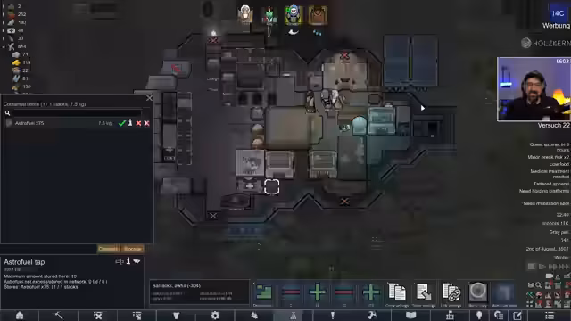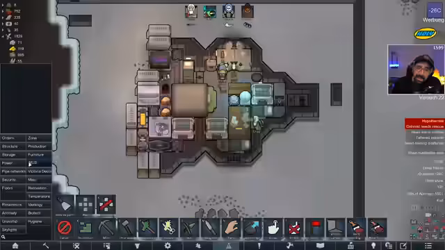 07:20:57Das Team spielt Rimworld in einem "krassen, wilden Run" gegen gottesähnliche Void-Kreaturen, wobei dies der 22. Versuch ist. Das kleine Raumschiff ist überfüllt, und die Kolonisten werden von Riesenfaultieren belagert. Der Plan ist, zu einem gefrorenen Terraformer zu fliegen, um dort Technologien für den Ausbau des Raumschiffs zu finden. Ein Kolonist, Kevin, benötigt noch vier Level für die Wiederbelebung. Autopsie-Forschung wird vorerst zurückgestellt, bis das Raumschiff größer ist. Die Belagerung durch die Riesenfaultiere zwingt das Team, sich im Raumschiff einzuschließen, bis die Tiere abziehen. Währenddessen wird weiter geforscht, unter anderem an moderneren Möbeln und industriellen Generatoren. Die Wall Fire Foam Poppers und Wall Trading Beacons werden als nützliche Wandmodule gelobt. Die Reise zum Terraformer wird fortgesetzt, wobei die Kälte eine große Herausforderung darstellt. Ein Jammer wird erfolgreich installiert, um die Drohnen zu stören, und das Team beginnt, den Terraformer zu erkunden, um Panels und andere Ressourcen zu finden.