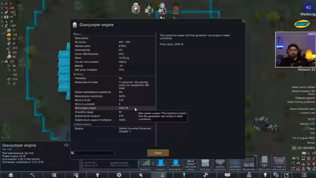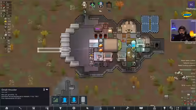 08:15:59Die Kolonie leidet unter einem extremen Mangel an Strom. Das Raumschiff produziert nur 44 Watt, was nicht annähernd für den Betrieb der Überlebenssysteme ausreicht. Der Streamer entscheidet, die Bauarbeiten an der Basis einzustellen und sich auf das Raumschiff zu konzentrieren. Er plant, eine größere Schiffsantrieb zu erforschen, um den Energiebedarf decken zu können. Der Fokus liegt auf dem sofortigen Bau von Vorräten, insbesondere Astrofuel, um die Fluchtmöglichkeiten zu sichern. Die Kolonie steht an einem kritischen Wendepunkt und droht ohne ausreichend Strom einzufrieren.